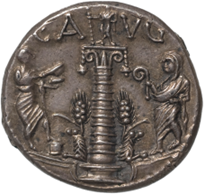 Dying at an impressive 93 years of age, L. Volusius Saturninus was honoured by the senate, at the behest of the emperor Nero, with nine statues in his honour. What is remarkable about the way in which the senate chose to honour Saturninus is that these statues depicted Saturninus in the guise of one the different roles he had held during his lifetime. He was depicted ‘as augur’ in the Regia in the Roman forum, ‘in triumph’ in a bronze statue in the forum of Augustus and in two statues in the temple of the divine Augustus, ‘as consul’ in one statue in the temple of the divine Julius, one on the Palatine Hill, and one in the area of the Temple of Apollo, ‘on horseback’ in a statue near the Rostra, and depicted on the curule chair of the magistrates in the Theatre of Pompey. What is remarkable about this, for me, is not only the extent to which the senate could divide and pigeonhole Saturninus’ long life into the various roles in which he performed, but also that the senate felt it to be worthwhile to depict each of Saturninus unique roles. It is likely that Saturninus’ statue ‘as augur’ depicted him capite uelato – that is with the fold of his toga across his head – and holding the distinctive lituus – the curved augural wand associated with the office. This pose can potentially be seen in the figure on the far right of the pictured coin, in which an augur is depicted, probably in the form of a statue. This pose is immediately recognisable and distinctive, posing questions of the extent of his public visibility in Rome, both as an augur whilst alive, and also as an augur now deceased.